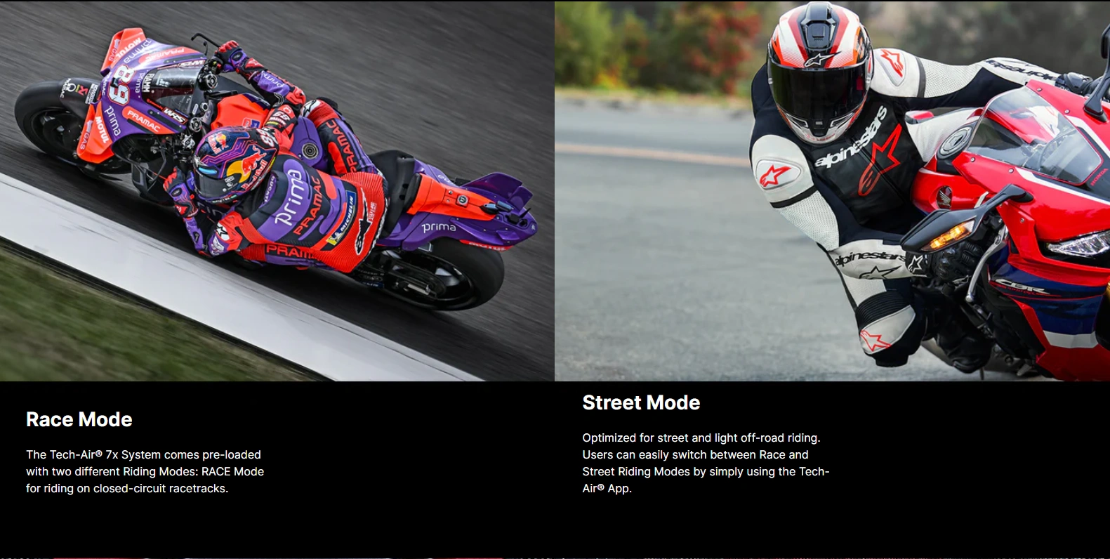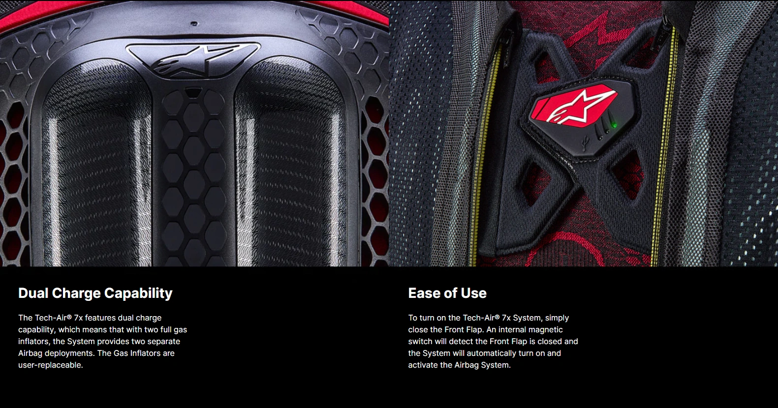 Specifically developed for road racing, track day use and performance road riding, the FIM-approved, Tech-Air® 7x System, is Alpinestars’ latest airbag system built from MotoGP-proven tech. Fully autonomous and self-contained, it delivers streamlined, ventilated protection across the shoulders, chest, full back, and coccyx. Designed for standalone use or integration with Tech-Air® compatible suits and jackets, the Tech-Air® 7x adapts to closed-circuit racing, road, and light off-road riding. With 12 onboard sensors and AI-driven crash detection, the system deploys the Airbag in as little as 44ms—cutting impact force by up to 90% vs. passive back CE Level 1 protection.